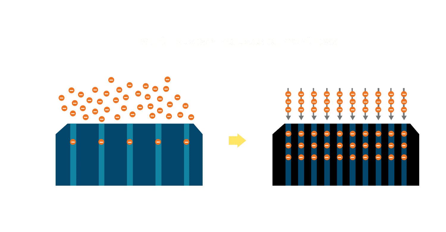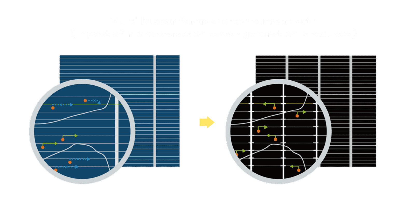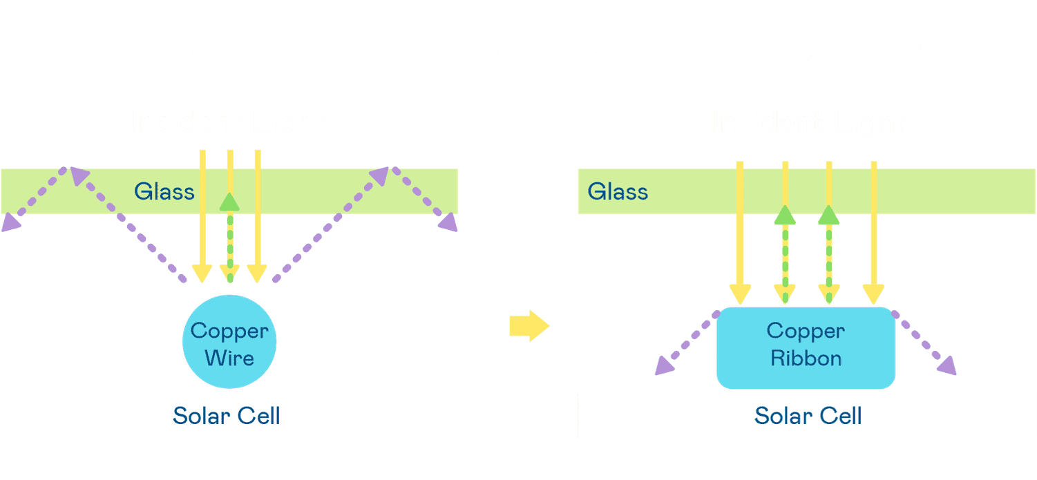 - 电池使用多条铜导线 (Copper wire) 于电池片上形成较短的电流路径,,提高电流收集效率,,采用圆形设计的铜导线较传统扁平式的铜焊带 (Ribbon),,可增加入射至电池的光线量。。