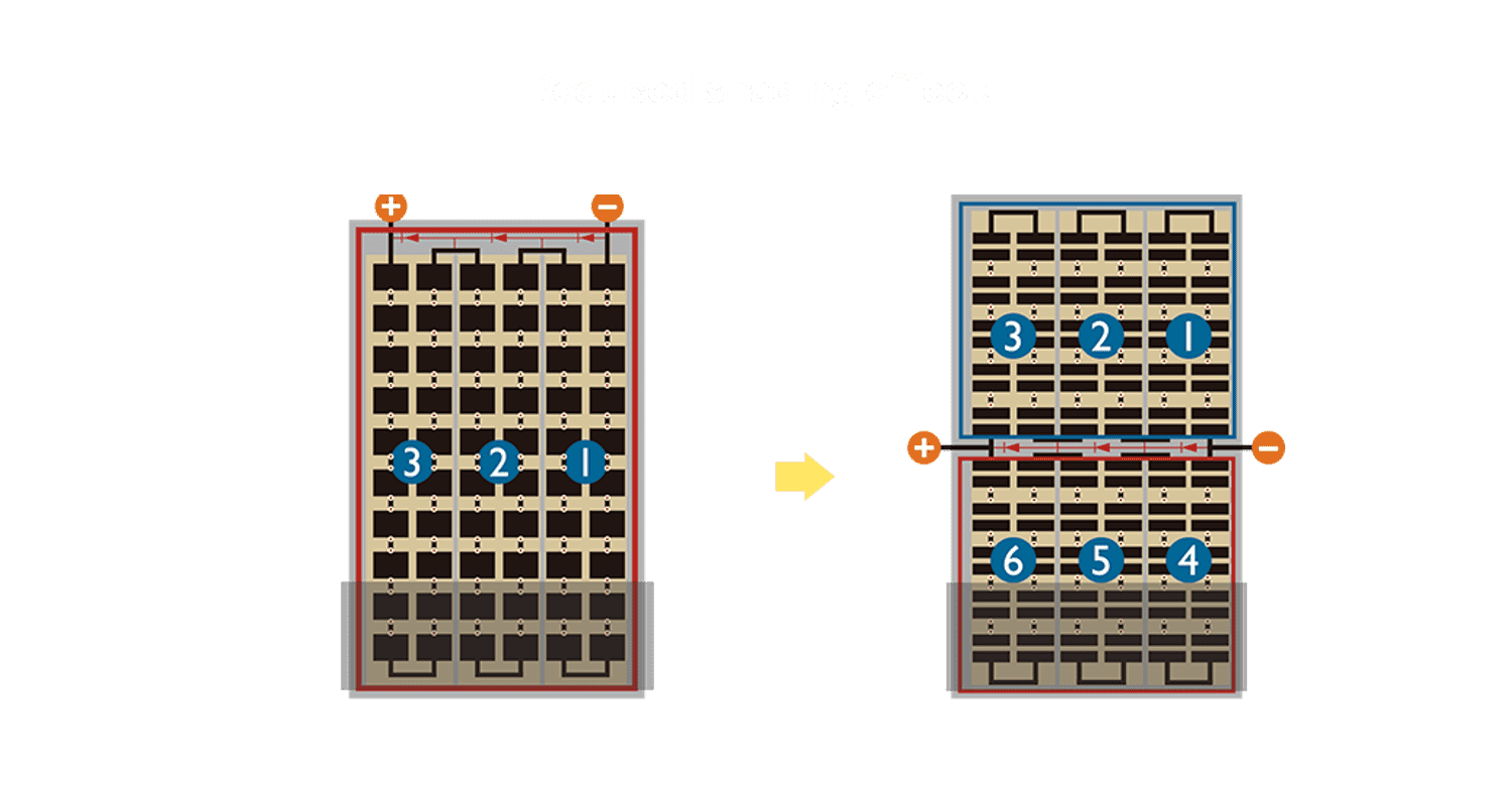 - 结合半切电池,,降低遮阴影响、、、提升模组抗隐裂能力、、、并减少电阻损耗,,,,进一步提升模组发电效能。。。。